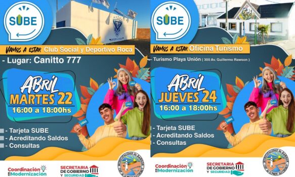 Los agentes SUBE estarán disponibles el Martes 22 de abril en el Club Social y Deportivo Roca, ubicado en Avenida Cañito N° 777 (zona norte de la ciudad) y el Jueves 24 de abril en la Oficina de Turismo de Playa Unión, situada en Avenida Guillermo Rawson N° 300.