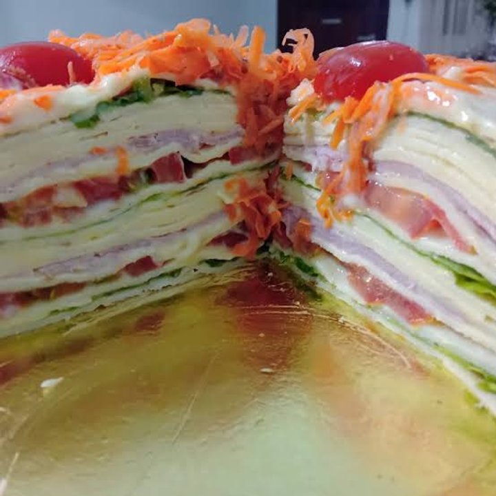 4. Vamos a ir armando la torre de la siguiente manera: Vamos a untar la mezcla en los panqueques y vamos intercalando los vegetales y el fiambre entre las capas. Y finalmente, a la heladera para que quede bien firme para cuando llegue el momento de cortarla.