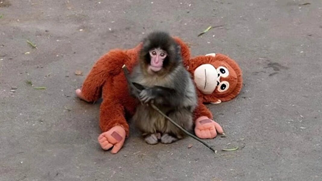 En un primer momento, los cuidadores intentaron que el mono se aferrara a toallas para que tuviera una referencia de contacto. Sin embargo, el pequeño terminó eligiendo un orangután de peluche de color naranja como objeto de apego. Desde entonces, no se separa de él, ni siquiera para dormir.